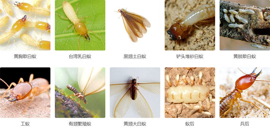 白蚁的种类有很多种,中国已知有白蚁4科、47属、480多种,国内28个省(市、自治区)均有分布。其中危害较严重的有土木栖的鼻白蚁科乳白蚁属的家白蚁(台湾乳白蚁)、散白蚁、土栖的黑翅大白蚁、堆砂白蚁、黄胸散白蚁等,对房屋建筑危害最严重的是家白蚁。
